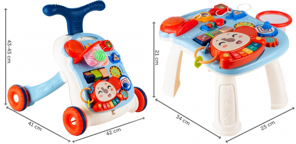 Produsul pe care il prezentam combina functiile unui impingator, masa educativa, panou, baschet si pian. Impingatorul, pe care il recomandam tuturor copiilor cu varsta peste 12 luni, este un asistent excelent pentru a invata sa mearga independent.