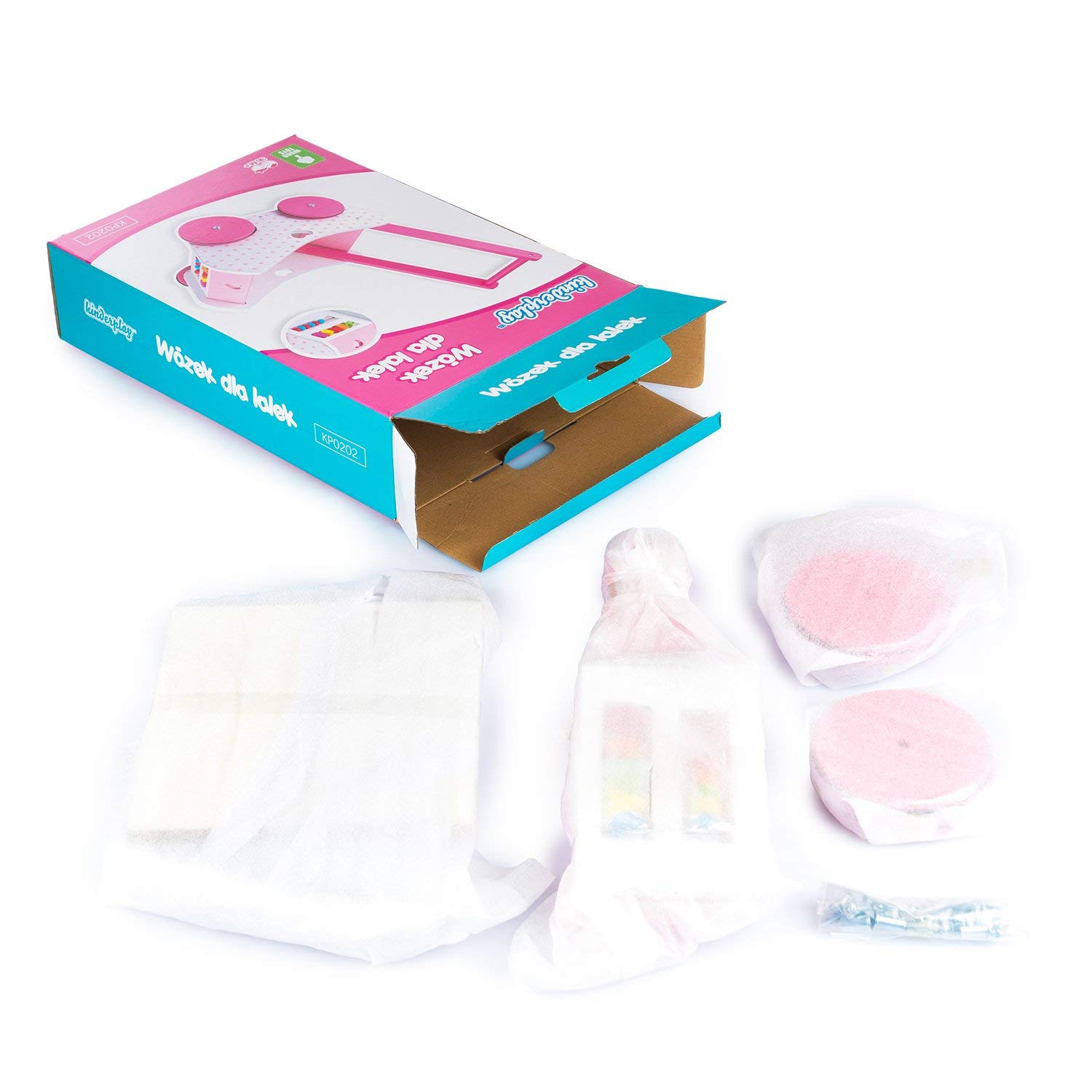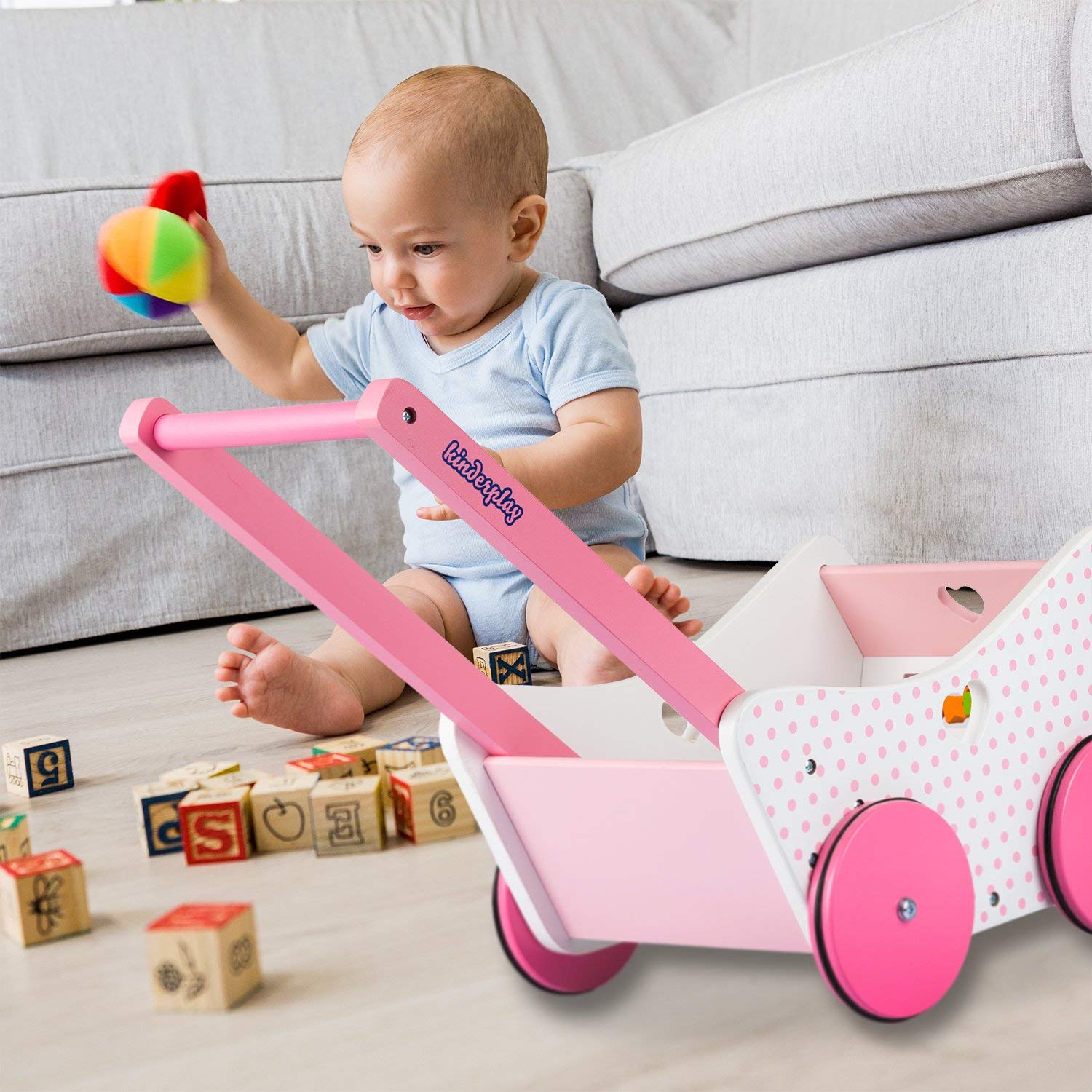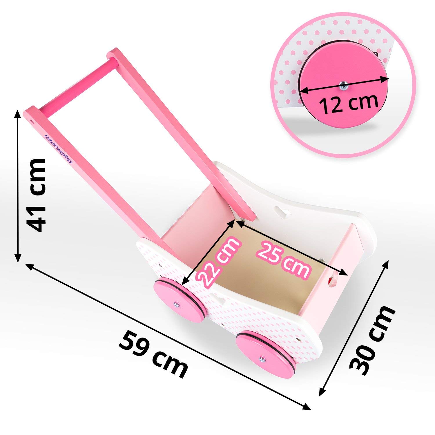 Acest carucior robust si stabil de papusi din lemn este partenerul ideal pentru primii pasi ai bebelusului.