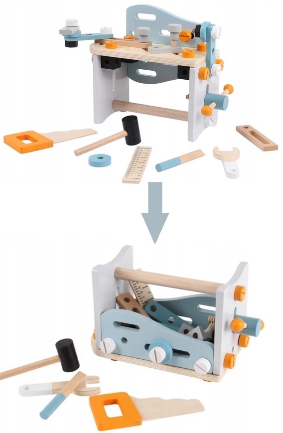 Banc de Lucru Transformabil din Lemn Natural 52 Unelte si Accesorii, „ISP EcoToys”, pentru Copii, Dezvolta Inteligenta, Abilitati Motorii si de Comunicare
