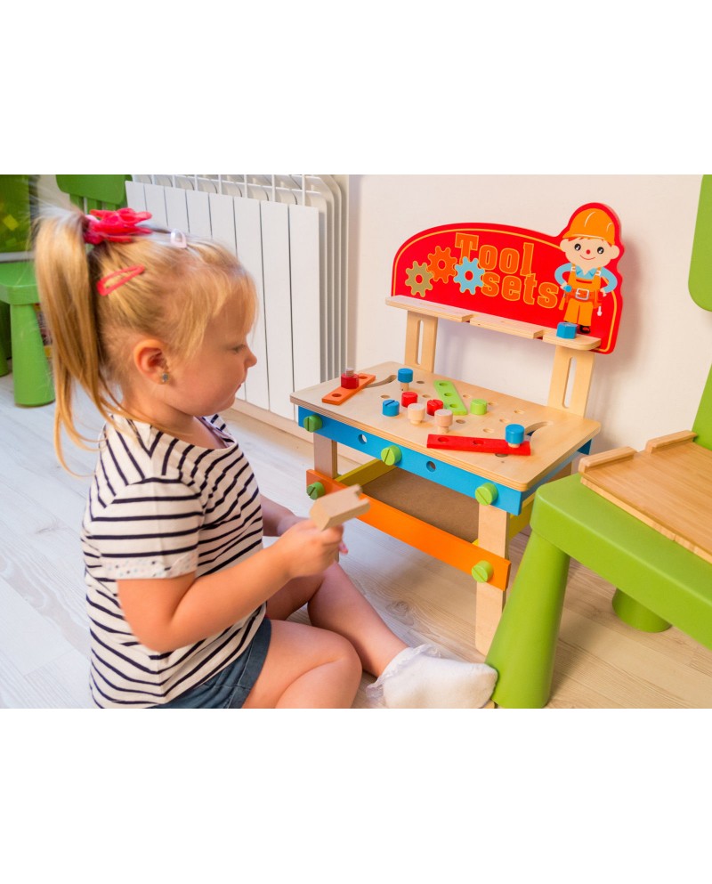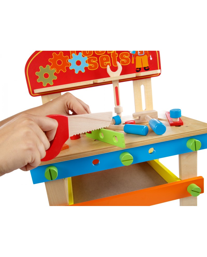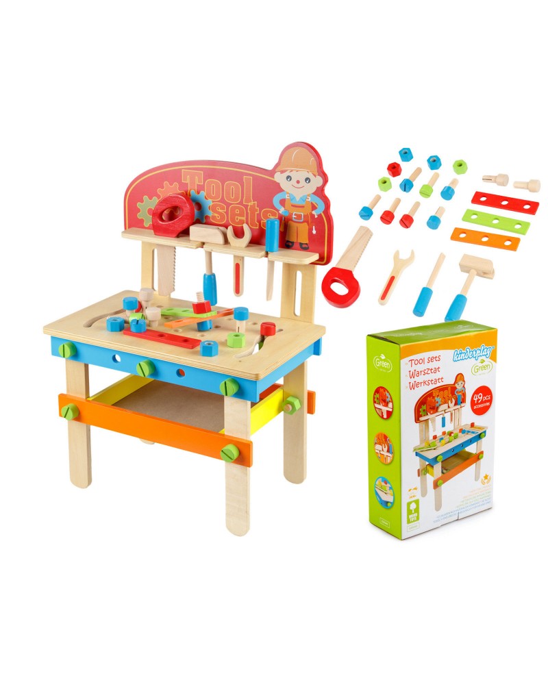 Bancul de lucru din lemn, GreenSeries, este un set care contine 49 unelte si accesorii, cu siguranta va satisface orice mic entuziast mic.