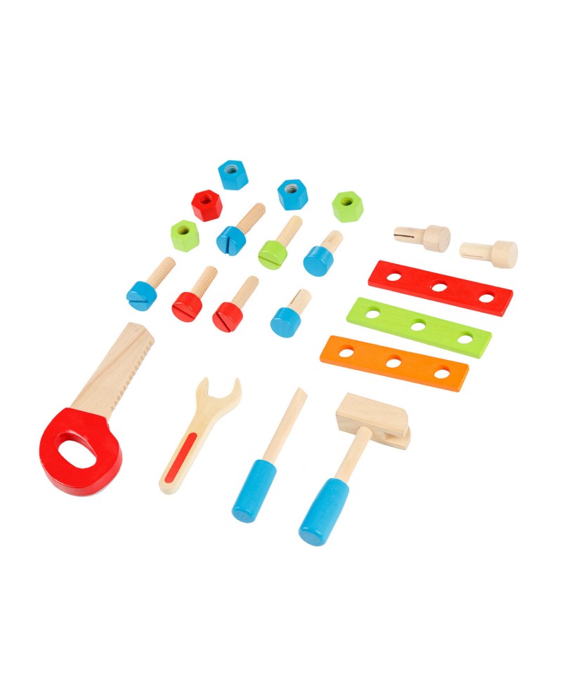 Setul este compus din 49 de elemente: ciocan, surubelnita, fierastrau, cheie, suruburi, placi