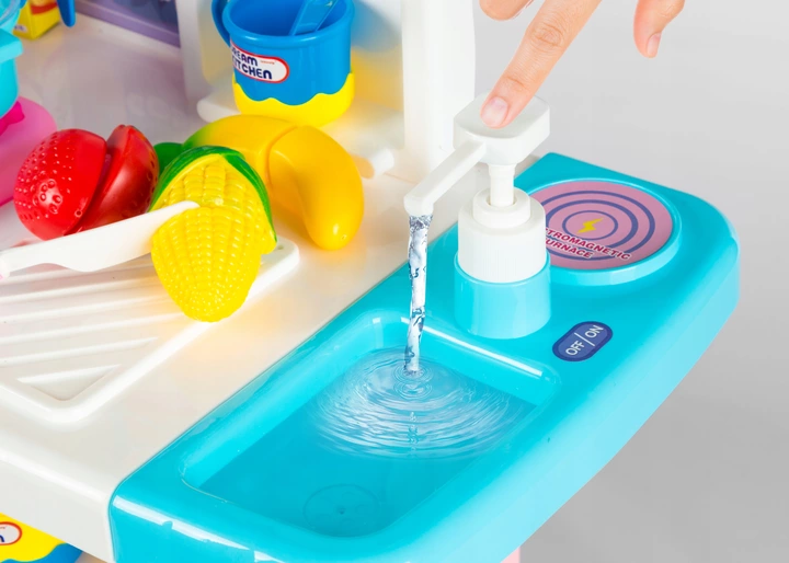 Bucatarie excelenta pentru micii bucatari carora le place sa imite activitatile adultilor! Design modern si culori stralucitoare. Bucataria are o chiuveta cu apa reala. Butoane rotative pentru cuptor si plita. Cand aragazul este pornit, luminile de sub vase se aprind si se aud sunetele de coacere. Multe elemente diferite iti vor spori imaginatia si ingeniozitatea.