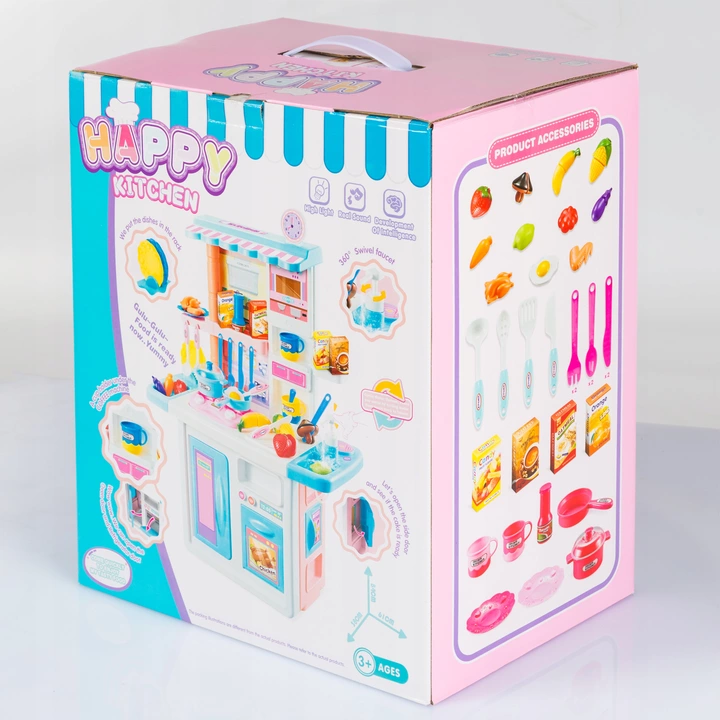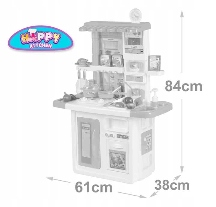 Happy Kitchen este o oferta de distractie interesanta si captivanta pentru copiii dornici sa imite adultii si se pot juca in siguranta cu bucatarii mici. Este ca o bucatarie realista, cu un cuptor si un frigider care se pot deschide, apa de la robinet si o multime de accesorii. Designul interesant si modern, precum si culorile frumoase ale bucatariei sunt doar cateva dintre caracteristicile acestei bucatarii. Butoanele pentru controlul cuptorului sunt pe blatul principal. Pe blat este o chiuveta, iar de la robinet curge apa! Accesoriile includ ghivece, farfurii, tacamuri, fructe, legume si cutii cu „mancare”. De inalta calitate si design unic!