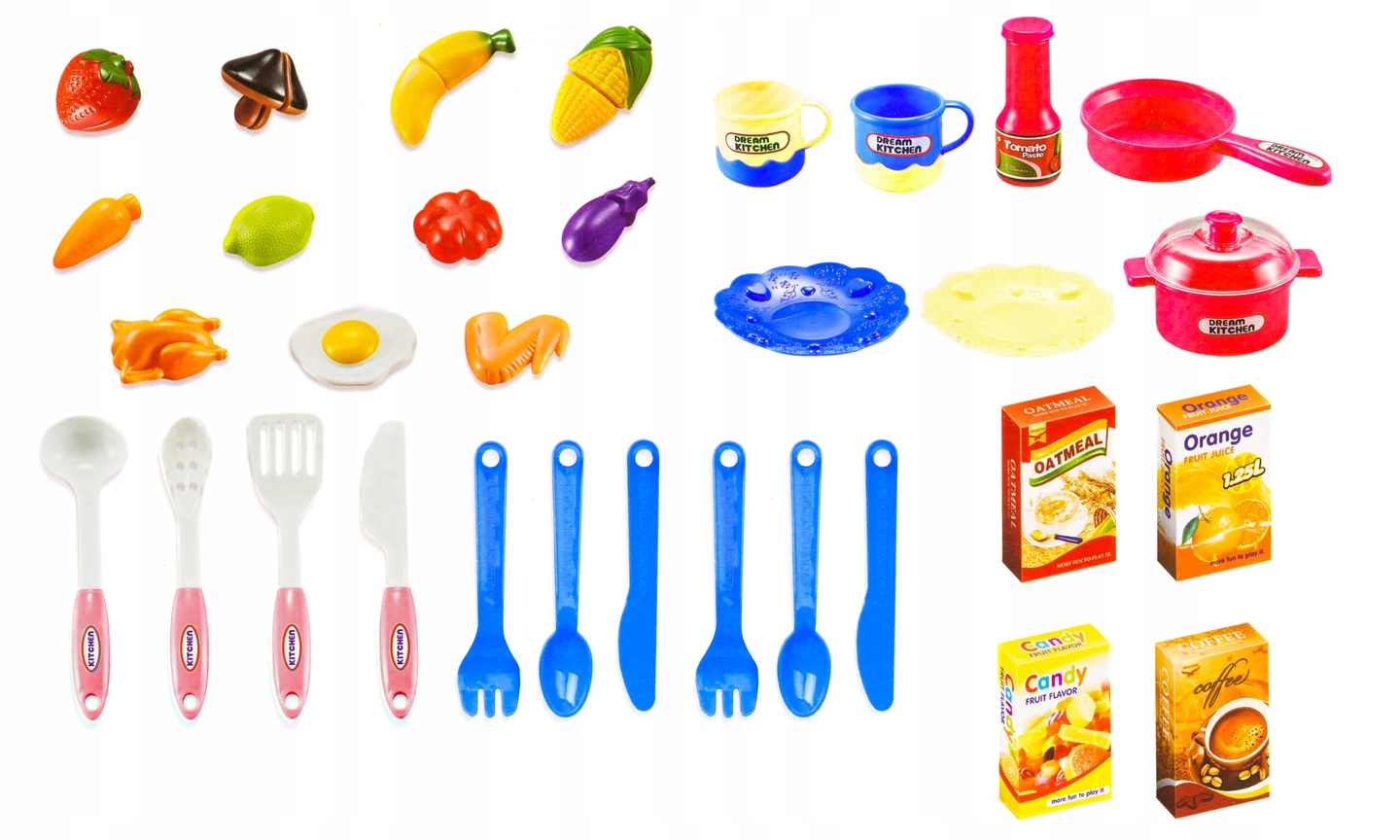 - setul include: vase, farfurii, tacamuri, legume, cutii alimentare
