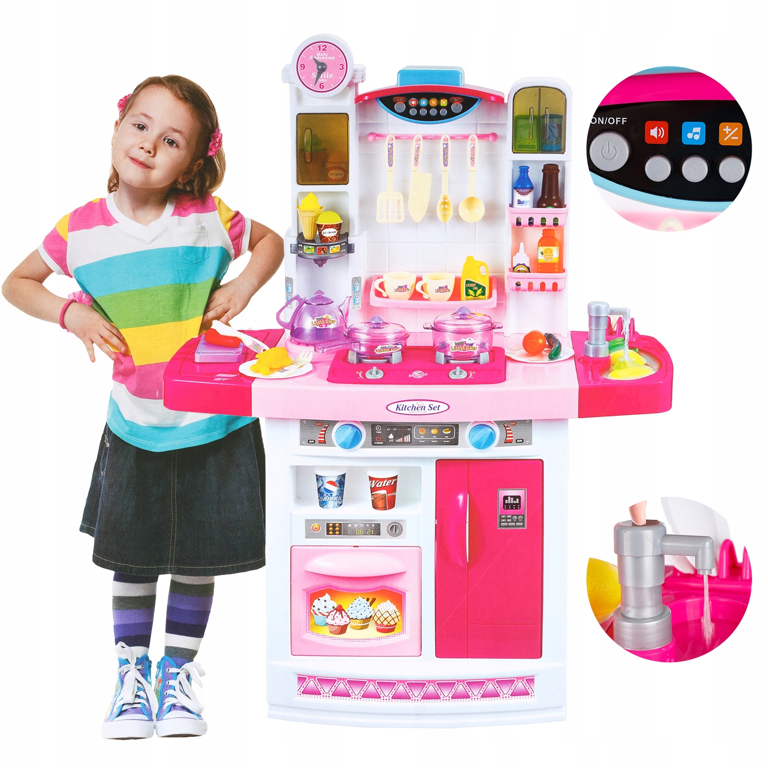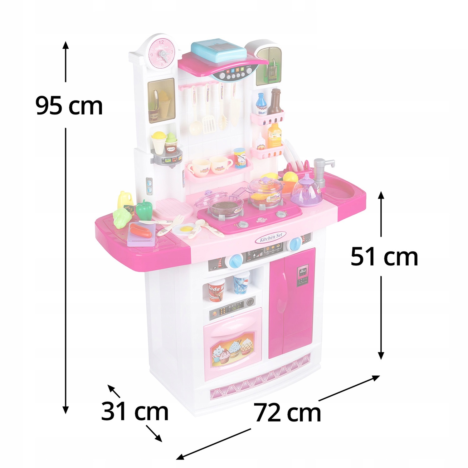 Bucatarie multifunctionala premium pentru copii cu lumini si sunete „Kitchen Set”, 95 CM, Consola de butoane, Cuptor, Frigider, Ceas, Chiuveta cu pompa apa, 45 accesorii, ROZ