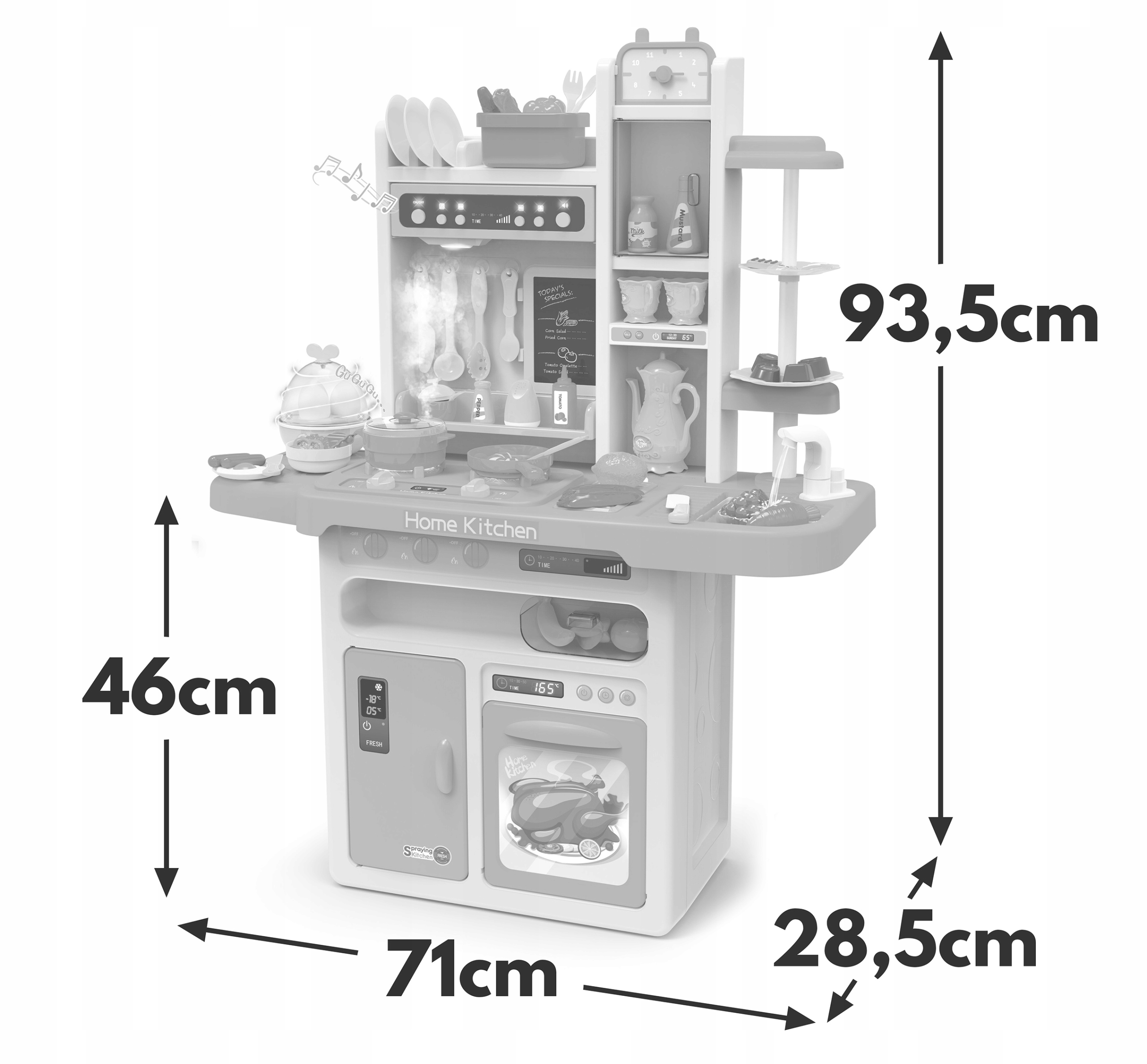 Nu numai ca va incanta un copil, dar ii va dezvolta dexteritatea. Bucataria noastra este o parte integranta a echipamentului fiecarui tanar bucatar (fructe, legume, oale, cani, decantatoare, farfurii, tacamuri, biscuiti, ciocolata, o serie din aceasta perioada cretacica, jajowar, ketchup, mustar, piper, lapte) .