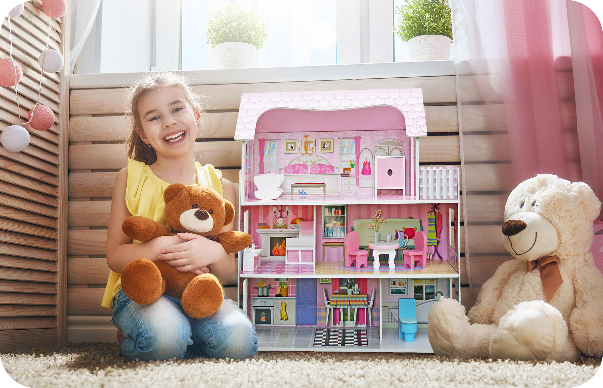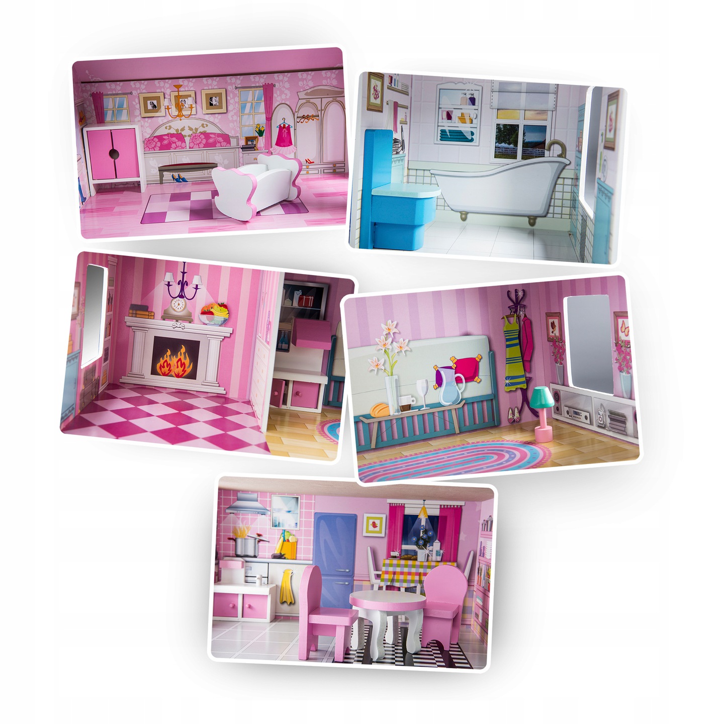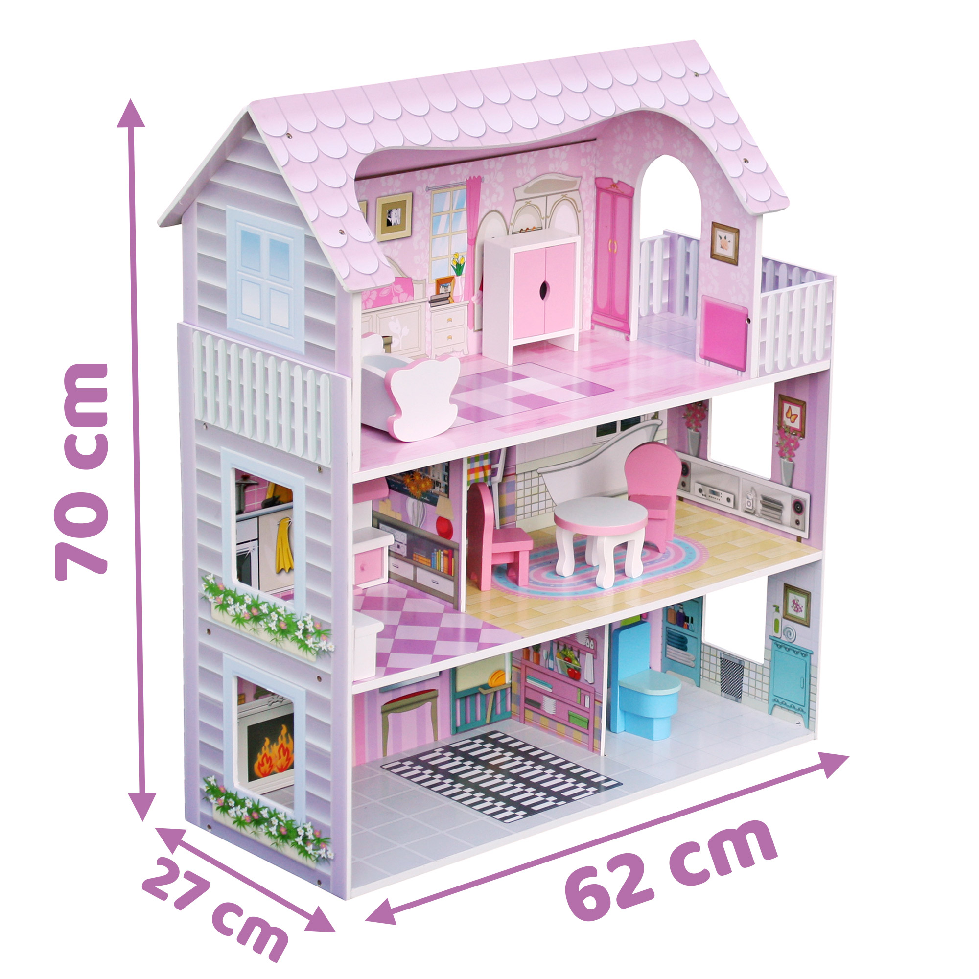 Casuta de papusi din lemn natural fara margini ascutite, „ISP LikeSmart RICO801” cu 3 Etaje, 5 Camere si 9 Piese de Mobilier, 70 cm Inaltime, Light Pink