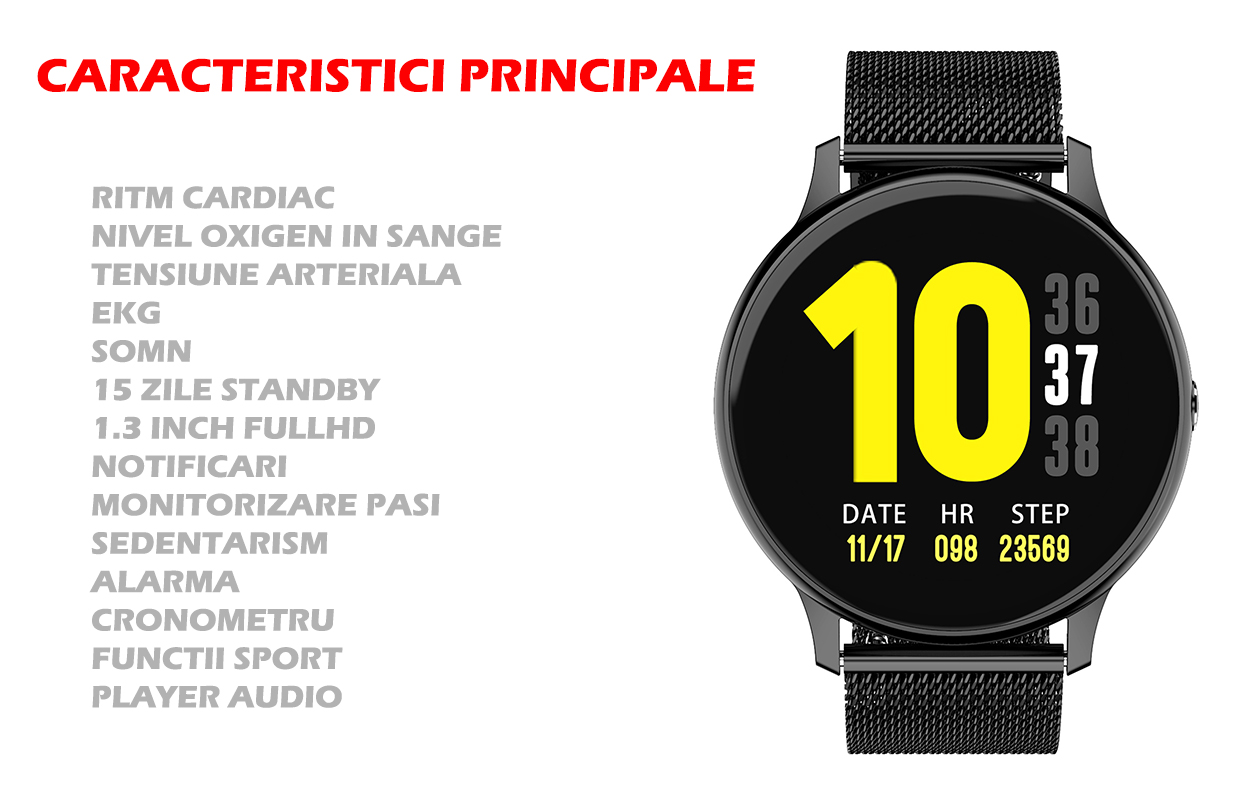 * Toate functiile, notificarile si setarile produsului se configureaza din aplicatia WEARPRO / ONWEAR ( ex: Ora , Notificari Mesaje si Apeluri, etc )