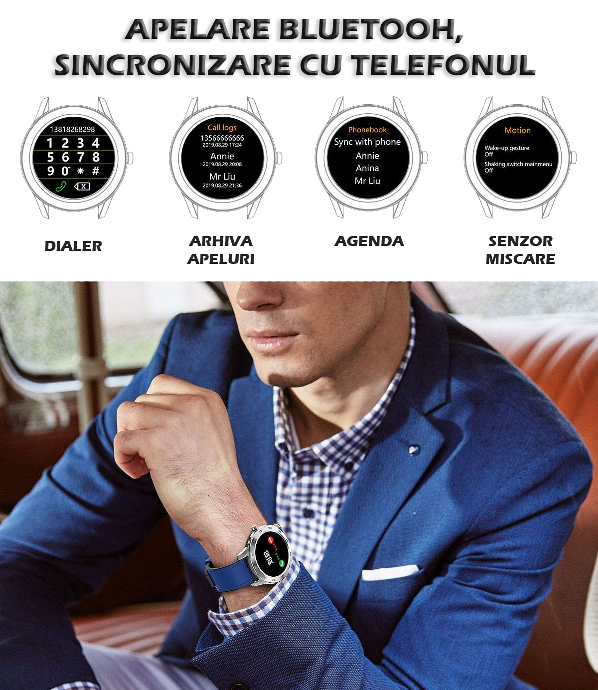 - Aplicatie: „FUNDO” (ceasul trebuie conectat la telefon prin aplicatie, NU direct prin bluetoothul telefonului)