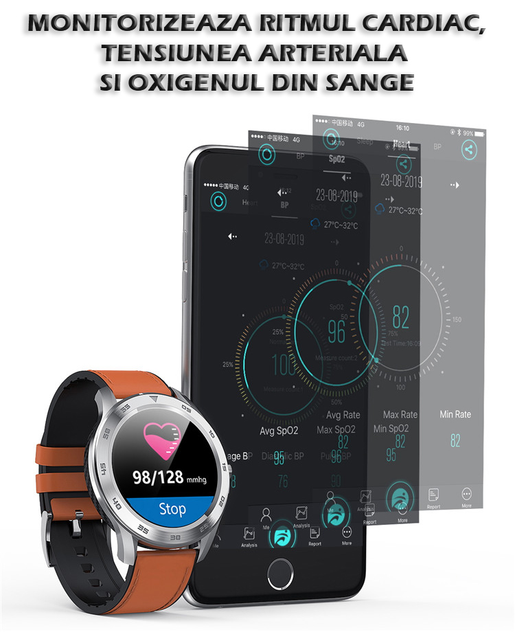 Monitorizarea sanatatii: masurarea ritmului cardiac in timp real (dinamic, static), masurarea tensiunii arteriale (se poate stabili cronometrarea masurarii tensiunii arteriale), masurarea oxigenului din sange, monitorizarea oboselii