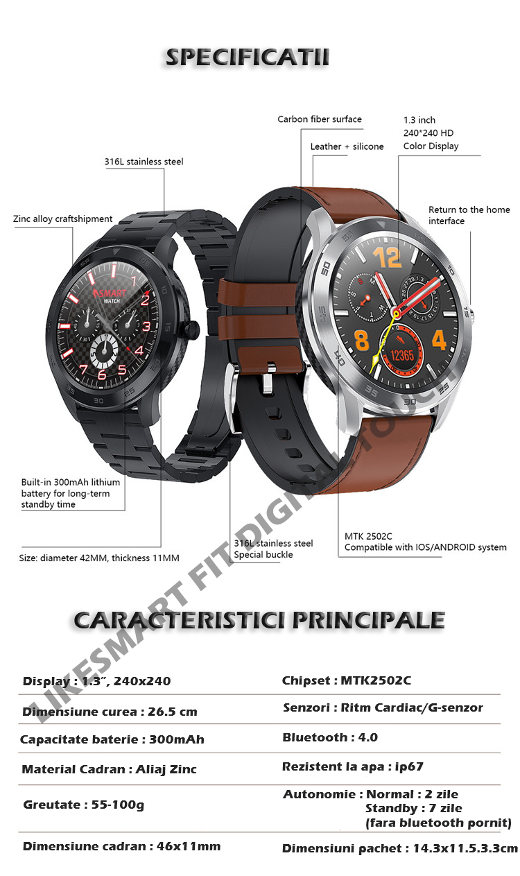 * Toate functiile, notificarile si setarile produsului se configureaza din aplicatia FUNDO ( ex: Ora , Notificari Mesaje si Apeluri, etc )