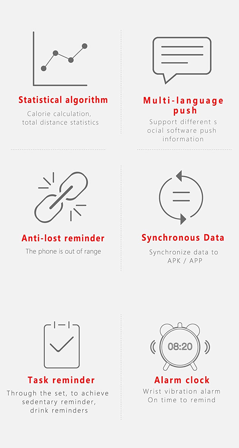 Alte functii: monitorizarea continua a ritmului cardiac 24 de ore, monitorizarea tensiunii arteriale, monitorizarea sangelui si analiza oxigenului din sange, 7 tipuri de moduri sportive, aprinderea ecranului la miscarea mainii, vizionarea informatiilor sincronizate, ecranul IP67 impermeabil, fete personalizate, cronometru, memento sedentarism, ceas cu alarma, anti-pierdere in ambele sensuri (bratara/telefon).