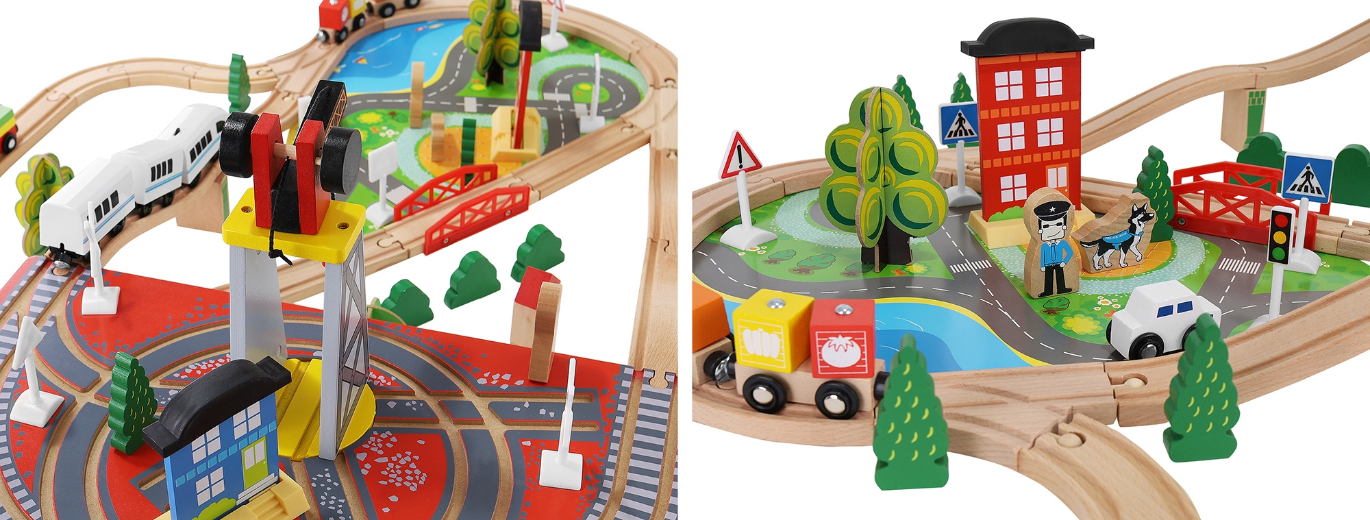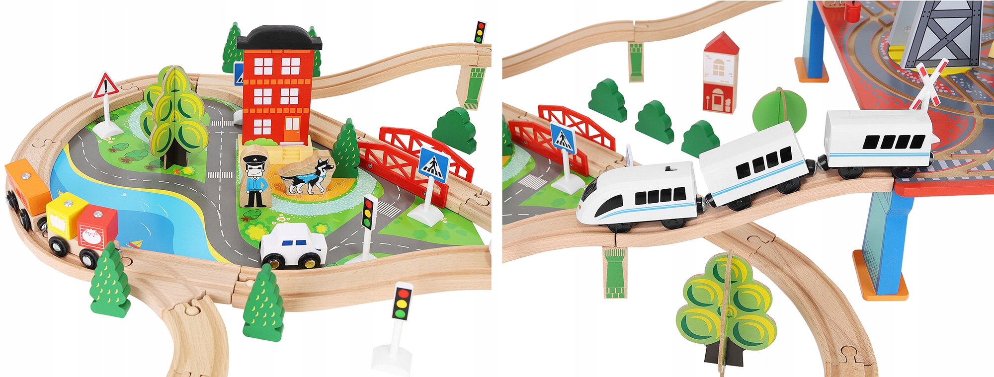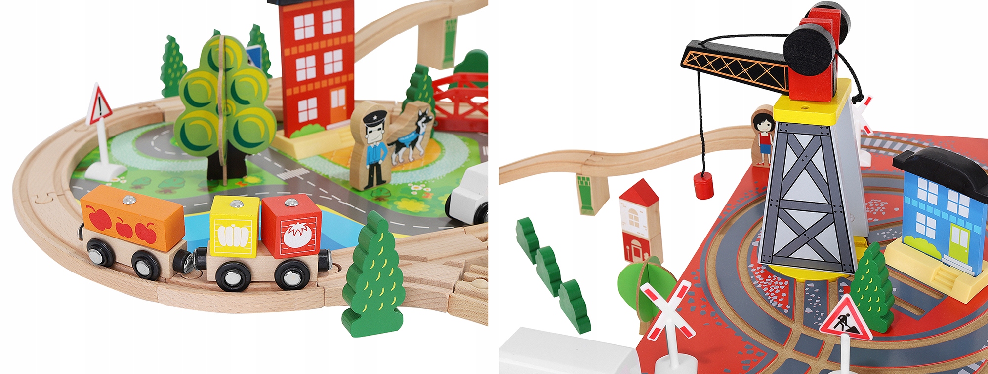 Trenul este o idee buna pentru a va exersa imaginatia si pentru a incuraja creativitatea copiilor. Este potrivit pentru joaca interioara si in aer liber. Setul este format din 88 de elemente fabricate cu precizie si frumos finisate, care pot fi reunite dupa propriile idei. Setul include o pista, un tren de marfa, un tren de pasageri, un vagon, mai multi arbori si semne de trafic, 3 persoane si un caine de politie, un port de transbordare cu macara si o placa care imita un drum pentru o masina. Elementele sunt conectate prin magneti – nu exista carlige inutile care ar putea sparge si ingreuna joaca copilului. Magnetii sunt puternici – nu se elibereaza nici atunci cand intregul set este ridicat. Setul va permite sa schimbati si sa extindeti pista in viitor cu elemente suplimentare, iar intregul circuit poate fi modificat liber. Calea ferata din lemn este, de asemenea, echipata cu un port de transbordare cu macara magnetica. Prin rotirea butoanelor, cream o miscare blanda care trage incarcarea inauntru sau in afara. Pentru a va juca cu masina, veti gasi o placa speciala care va permite sa va deplasati masina atat pe pista, cat si pe tabla.
