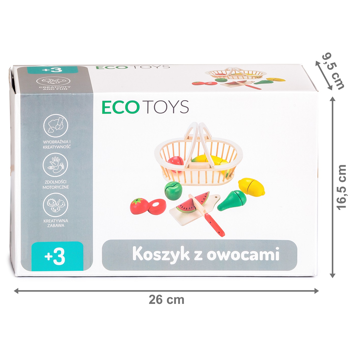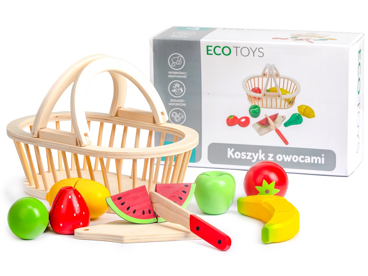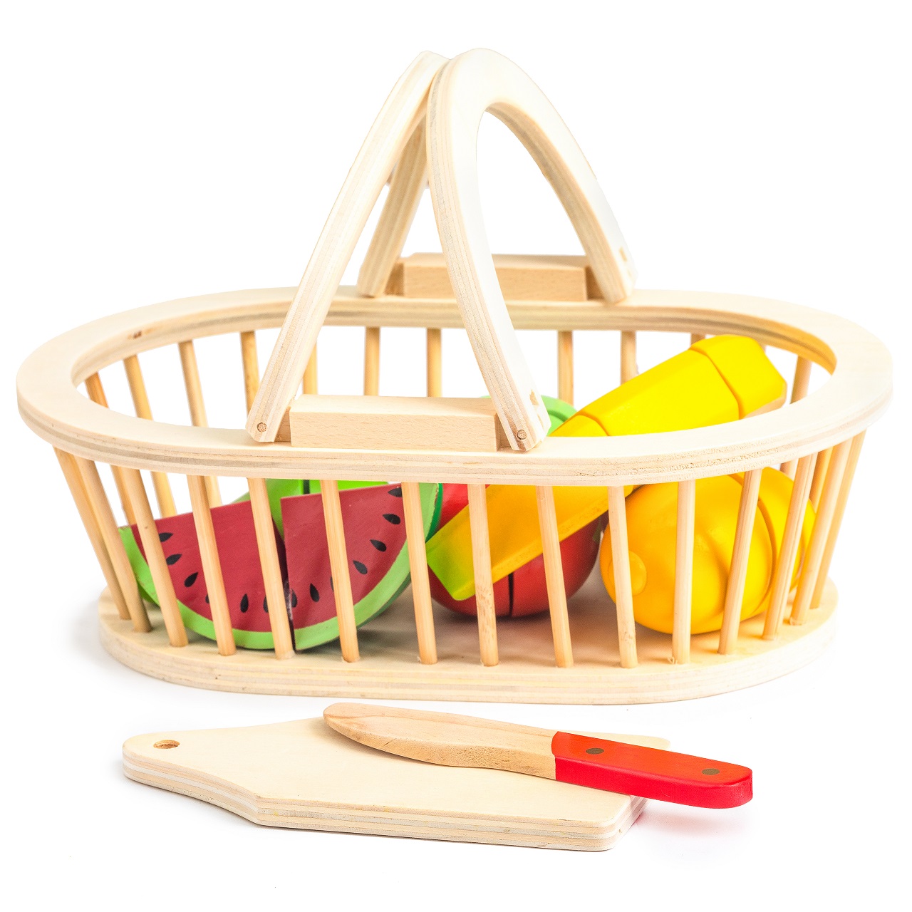 Toate elementele setului sunt confectionate din lemn si acoperite cu vopsea sigura pentru copii. Alaturi de cos si fructe, trusa include si un tocator din lemn si un cutit de tocat. Fructele sunt formate din jumatati conectate cu Velcro, care la taiere pune o usoara rezistenta si face un sunet ca atunci cand taiati fructe reale. Fiecare dintre ele a fost realizata cu mare atentie la detalii si siguranta copiilor, jucaria este lipsita de elemente periculoase si margini ascutite.