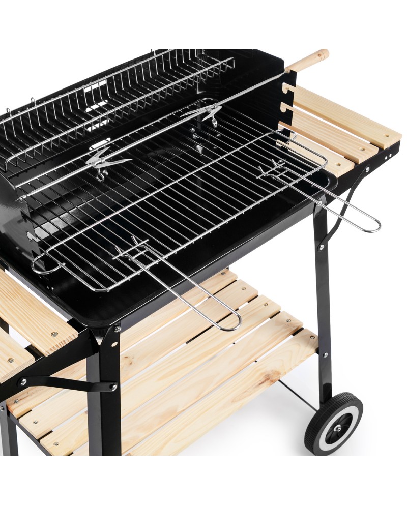 Gratar pe Carbune Multifunctional ISP „Grill & Chill” cu 3 Rafturi Din Lemn Natural Pentru Depozitare, Metal Tratat Anticoroziune, Dreptunghiular Cu Roti Pentru Transport Facil, Negru si Sort „Master Grill” Cadou