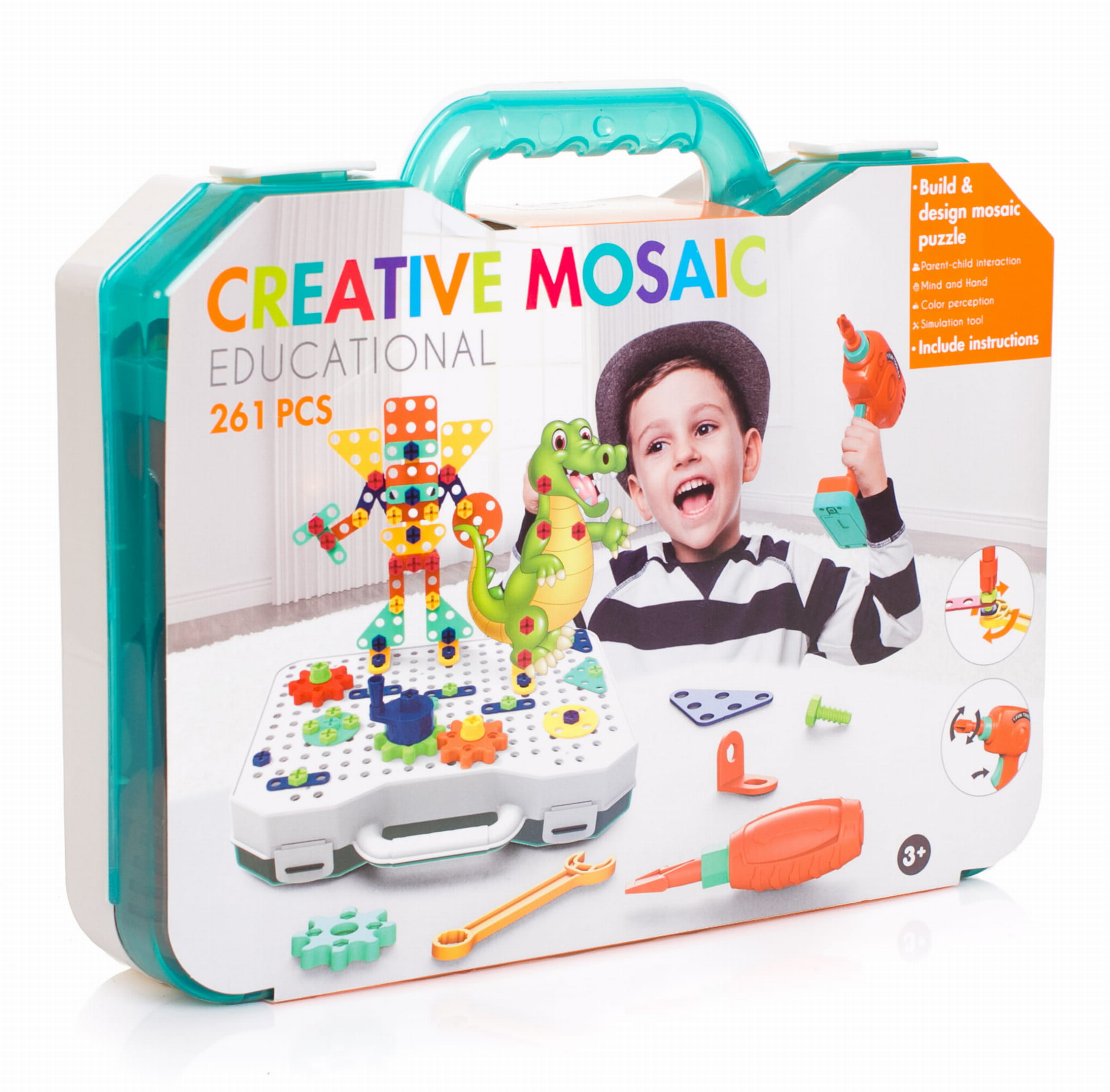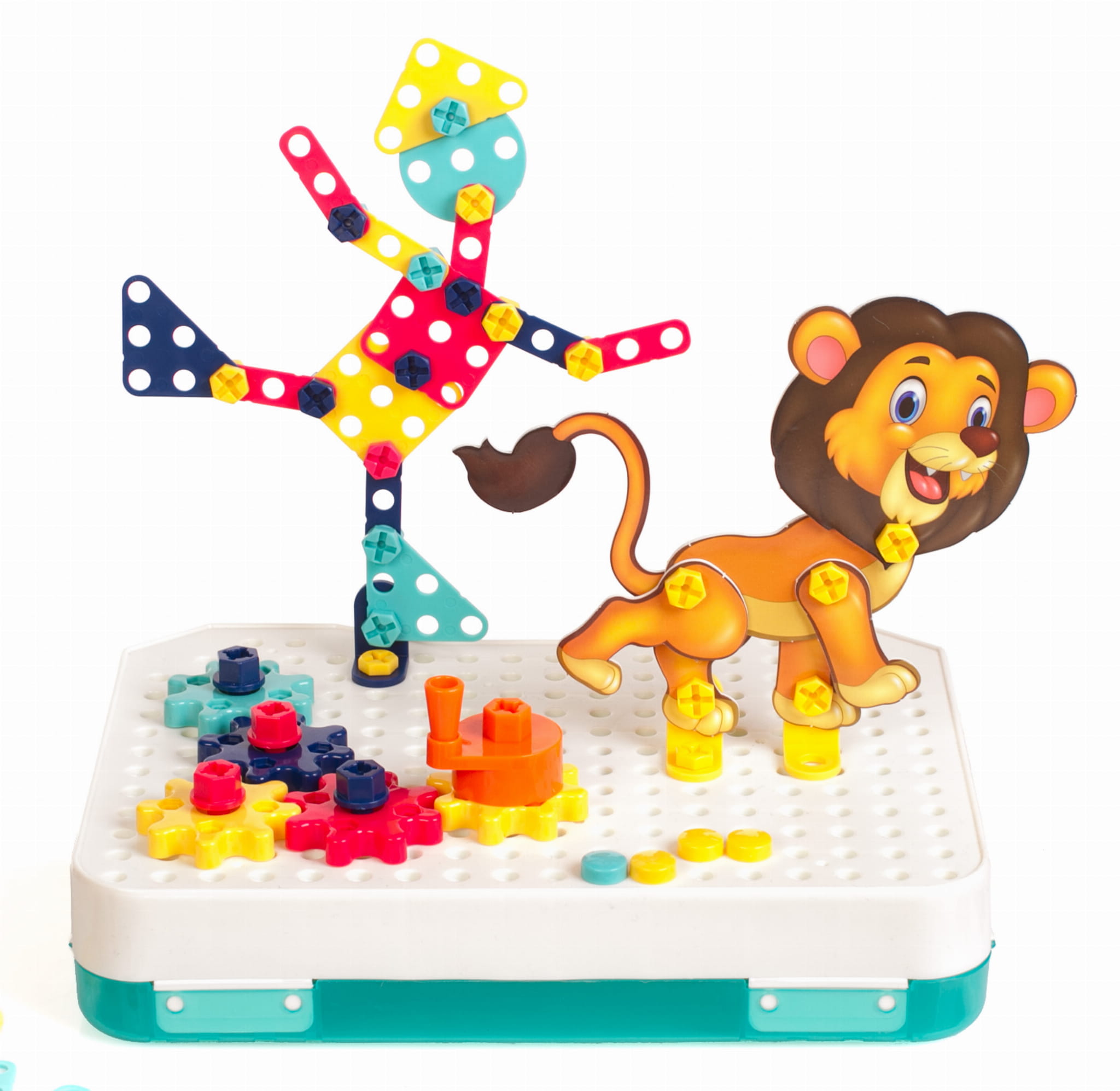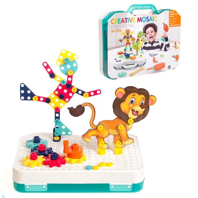 Acest set te va surprinde prin versatilitatea si calitatea sa. Toate piesele sunt fabricate din plastic durabil, de inalta calitate si sigur. Designul creativ de mozaic ajuta la dezvoltarea mobilitatii mainii copilului, a imaginatiei si a perceptiei culorilor. Setul include placi, diverse piese, suruburi, surubelnita.