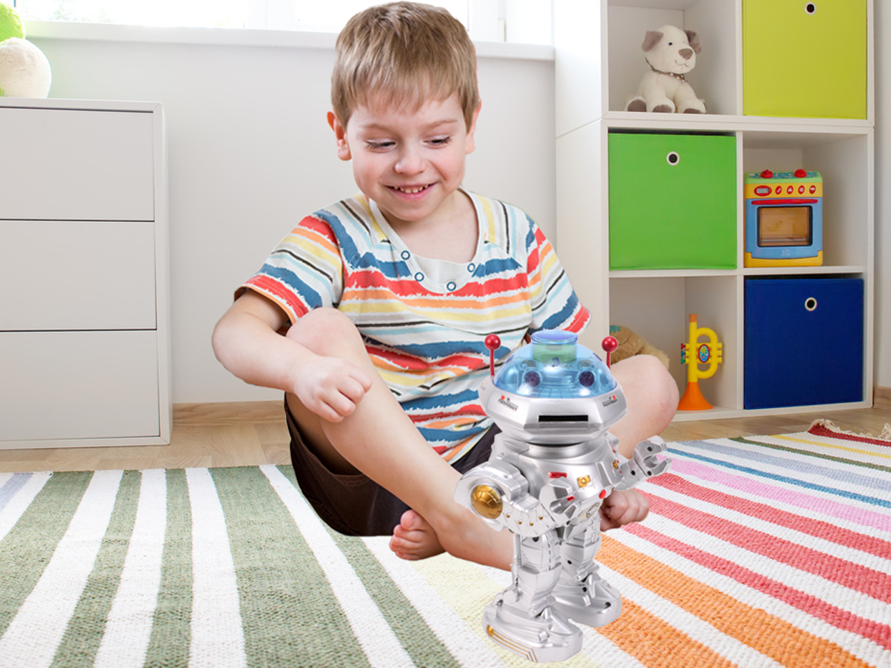 O optiune senzationala suplimentara este capacitatea de a programa o serie de functii care trebuie indeplinite de robot. Danseaza – doar activeaza functia de pe telecomanda! Vorbeste, avertizeaza cu privire la impuscare, trage cu inele de spuma sigure.