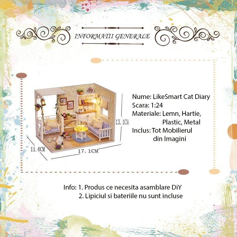 Macheta Casuta gata de Asamblat, in Miniatura, din Lemn „LikeSmart Cat Diary”, DiY, Lumini LED, stil retro cu mobilier, 13x17x11 cm