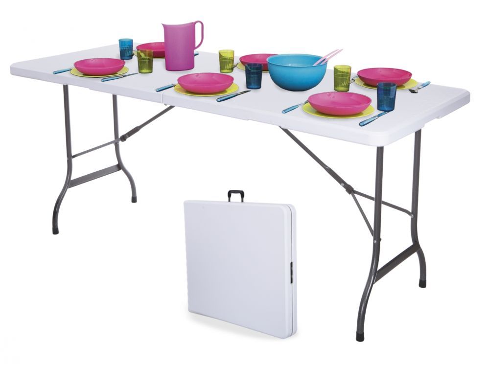 - Blatul de masa este confectionat din plastic rezistent, cu o dimensiune practica (240 x 70 cm) care garanteaza un confort ridicat de utilizare.