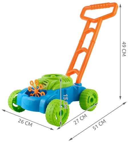 Jucaria este destinata copiilor cu varsta de peste 3 ani. Paleta pentru bule este alimentata de baterii si poate crea bule suflate din partea din fata a masinii de tuns iarba.