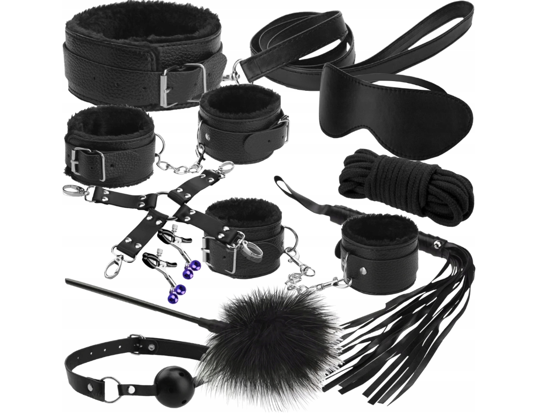 12 ELEMENTE – setul este format din: 2 perechi de catuse pentru picioare si brate, o franghie groasa, o masca pentru ochi, un guler cu lesa, un bici, un calus cu minge, curele care leaga catusele, o banda la ochi, pene si mamelon cleme . Datorita continutului sau bogat, va va permite sa scapati de rutina din fiecare dormitor.