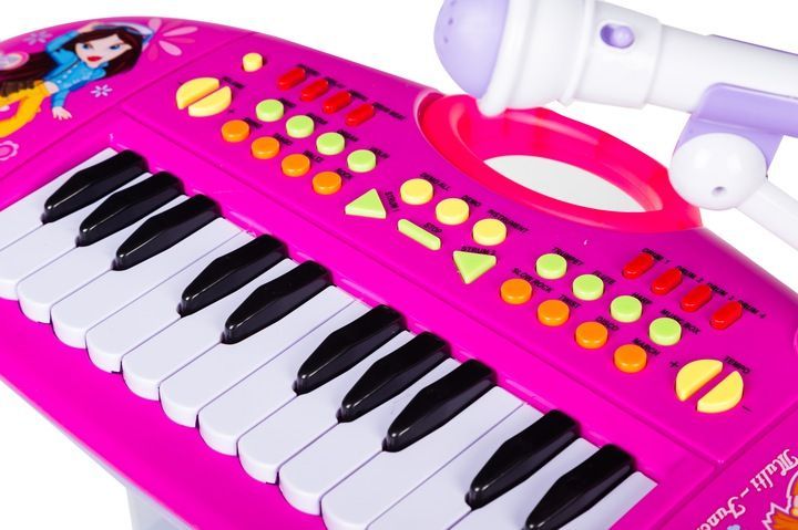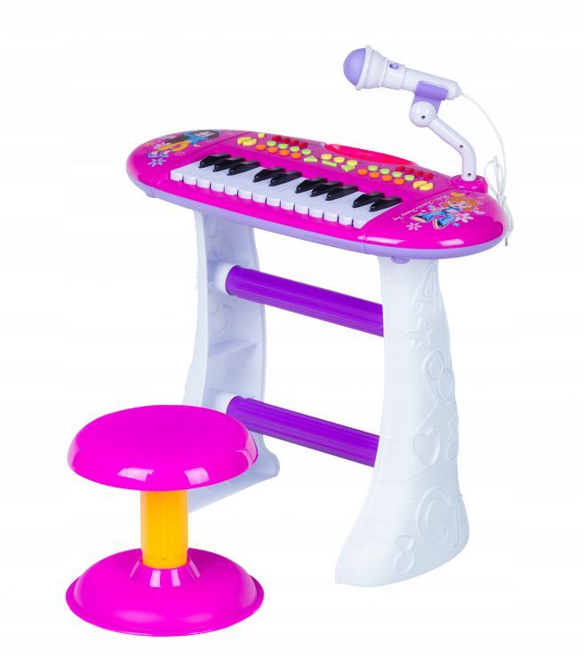 Set Complet Muzical Copii cu Orga Electronica, Microfon, Tobe si Scaunel, „ISP Piano Singer”, 24 Taste Pian, 8 ritmuri diferite, 8 sunete de instrumente diferite, Roz