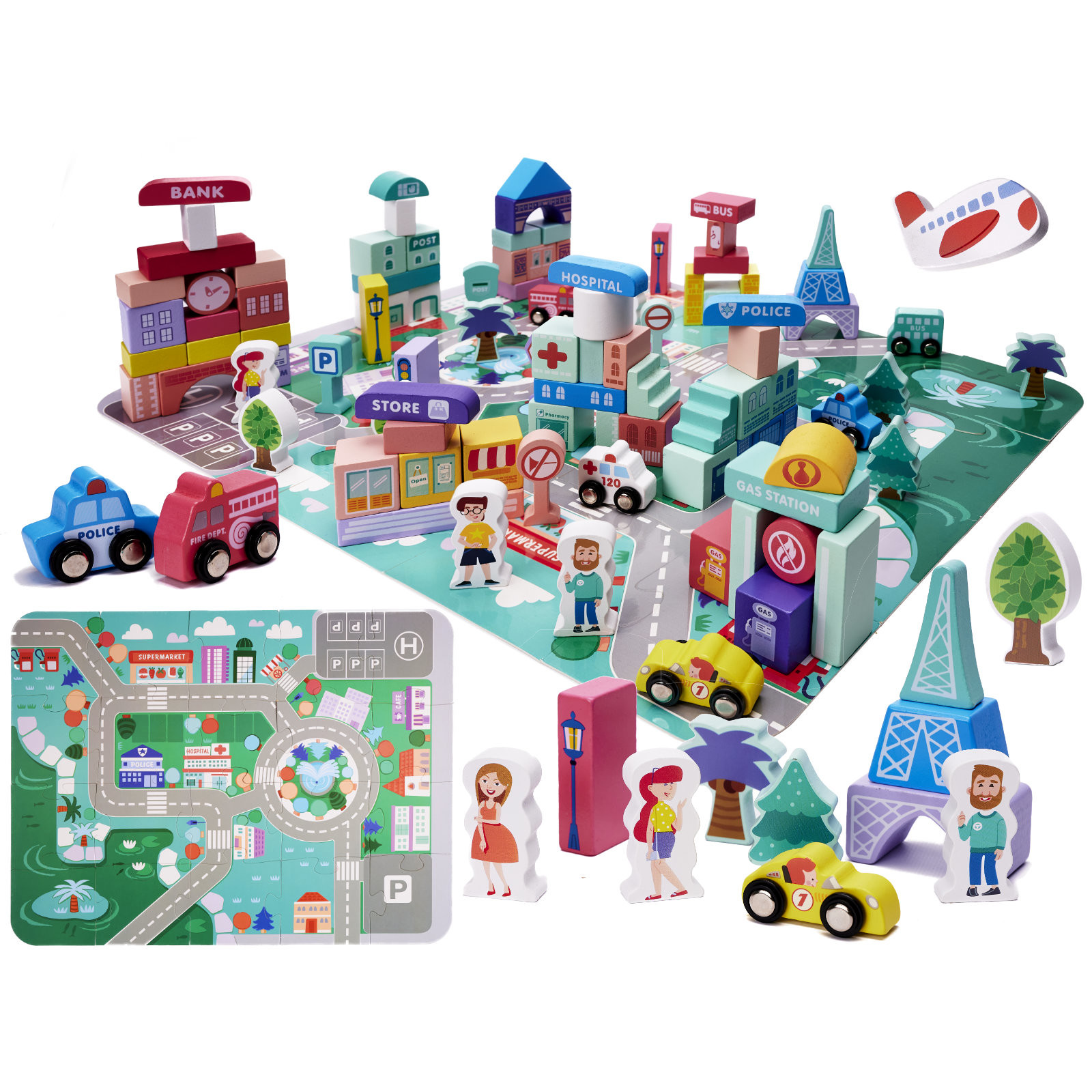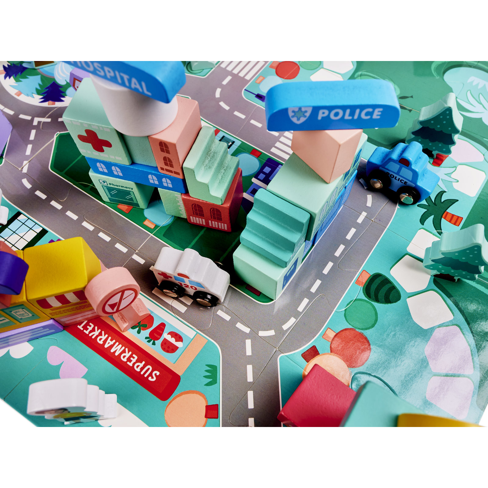 Orasul nu poate rata cel mai important lucru – strazile si masinile. Setul include puzzle-uri care, atunci cand sunt aranjate, vor crea o tabla cu o fasie de strazi. Vor fi o completare perfecta a intregului.