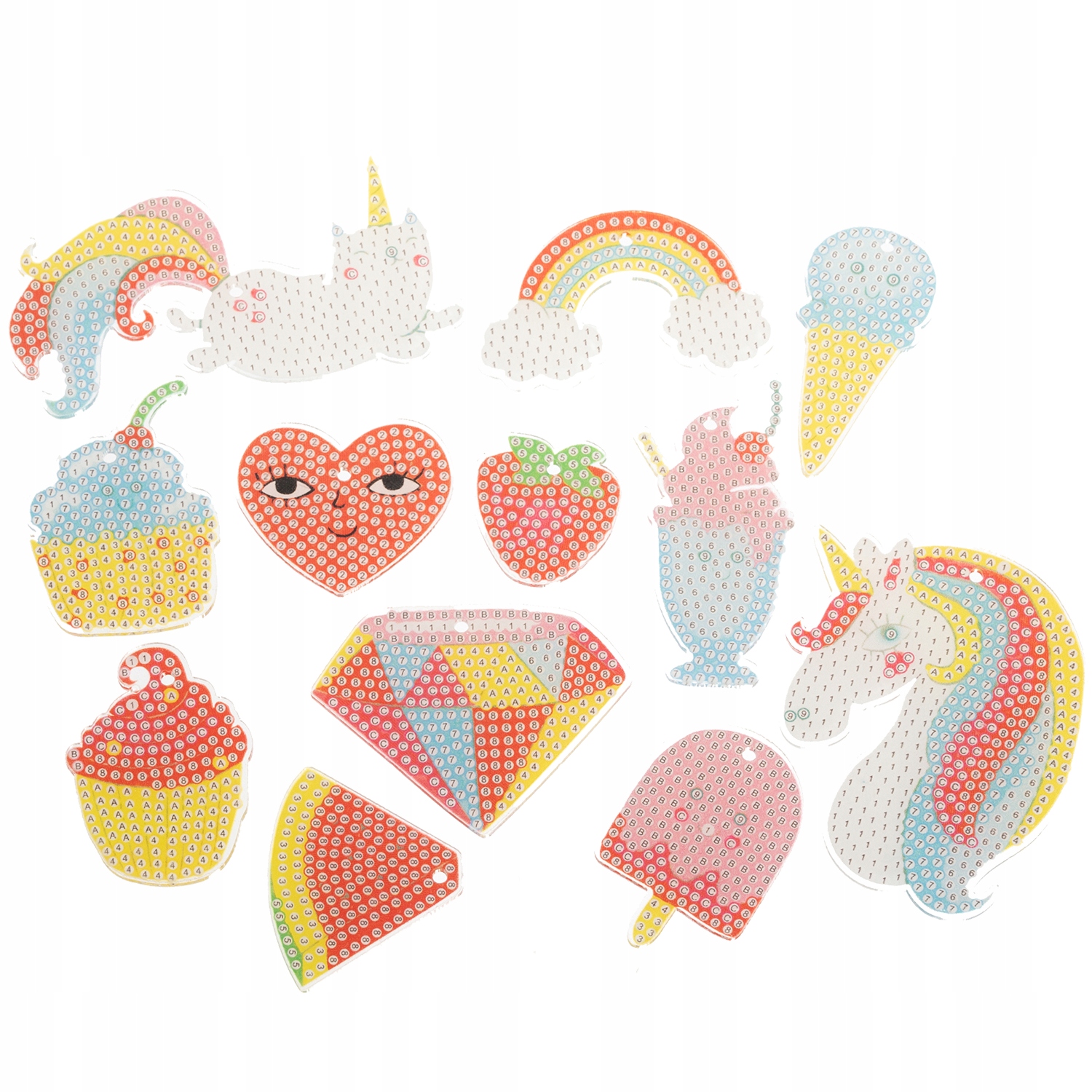- 12 modele din plastic (inima, capsuni, 2x gheata, 2x cupcake, diamant, pepene verde, curcubeu, unicorn, pisoi, ceasca de gheata)