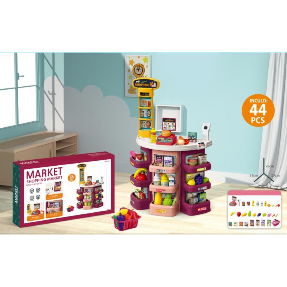 - Setul contine supermarket pentru copi, cu 44 de accesorii: casa de marcat cu computer cu ecran LCD, scaner cu lumina si sunet (scanerul are buton pentru bar code), cos de cumparaturi, alimente, accesorii.